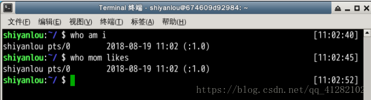 输出的第一列表示打开当前伪终端的用户的用户名(要查看当前登录用户的用户名,去掉空格直接使用 whoami 即可),第二列的 pts/0 中 pts 表示伪终端,所谓伪是相对于 /dev/tty 设备而言的,还记得上一节讲终端时的那七个使用 [Ctrl]+[Alt]+[F1]~[F7] 进行切换的 /dev/tty 设备么,这是“真终端”,伪终端就是当你在图形用户界面使用 /dev/tty7 时每打开一个终端就会产生一个伪终端, pts/0 后面那个数字就表示打开的伪终端序号,你可以尝试再打开一个终端,然后在里面输入 who am i ,看第二列是不是就变成 pts/1 了,第三列则表示当前伪终端的启动时间。