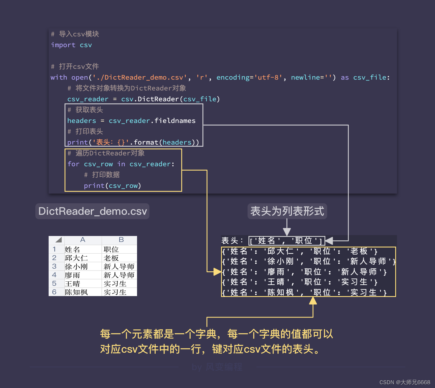 通过fieldnames取得表头是列表形式的。for循环遍历DictReader后,打印了除表头外的所有内容,其中的每一个元素都是字典,字典的键就是表头。如图所示。