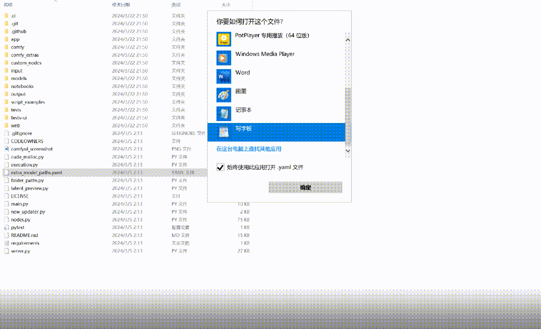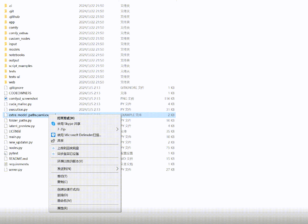 双击进入【ComfyUI】文件夹→找到【extra_model_paths.yaml.example】文件→单击右键,在弹出的菜单面板中选择【重命名】(或快捷键F2)→删除“.example”后缀,注意是带上标点符号“.”一起删除→保存即可。