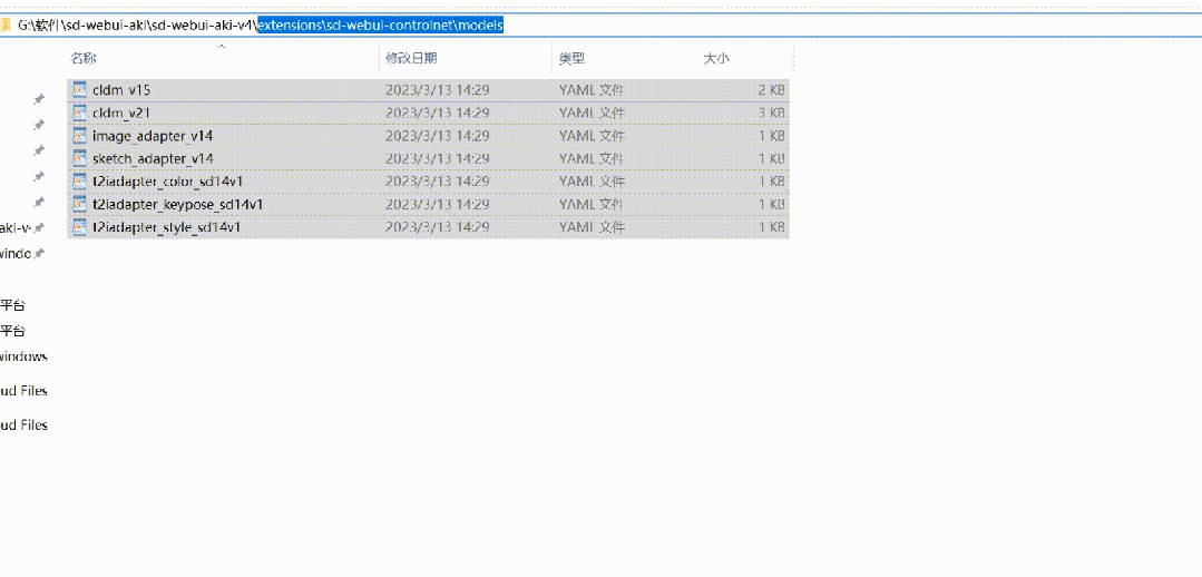 3.2.5、查看自己sd模型的路径(在———系统盘\sd-webui\extensions\sd-webui-contronet\models),复制“extensions”之后的路径,粘贴到“contronet:此处是sd模型的路径”,例如,我的sd模型路径是“G:\软件\sd-webui-aki\sd-webui-aki-v4\extensions\sd-webui-controlnet\models”,那么最终的格式就是“contronet:extensions\sd-webui-controlnet\models”
