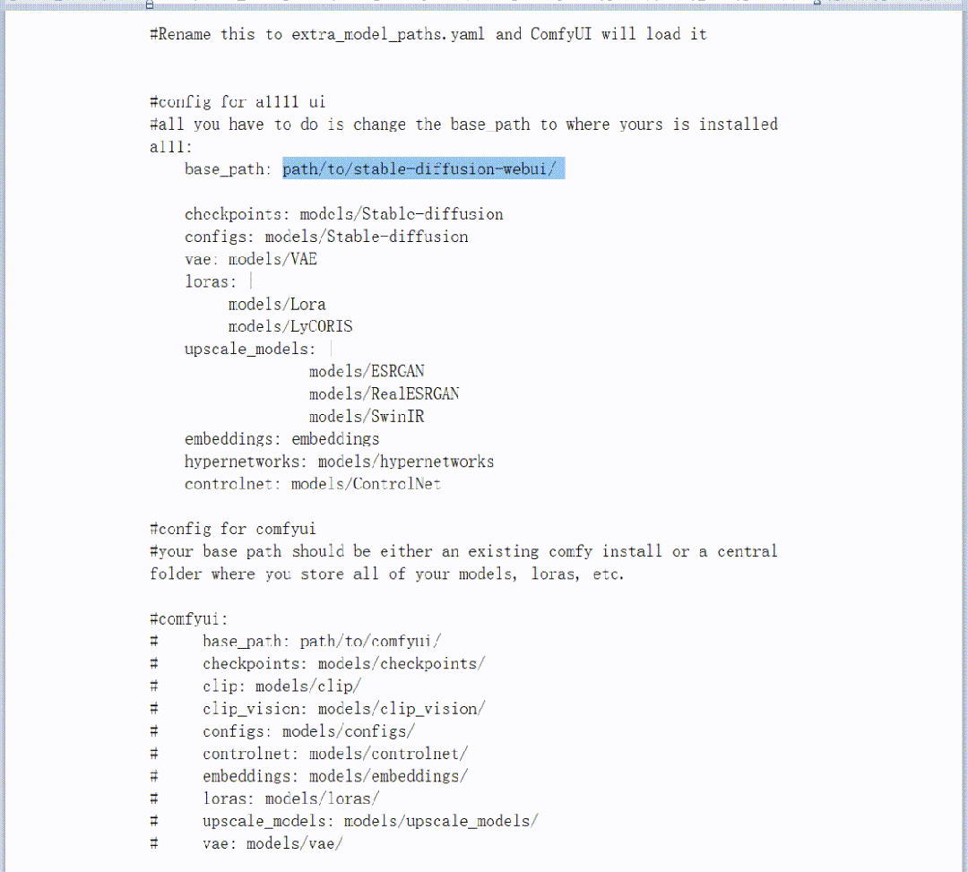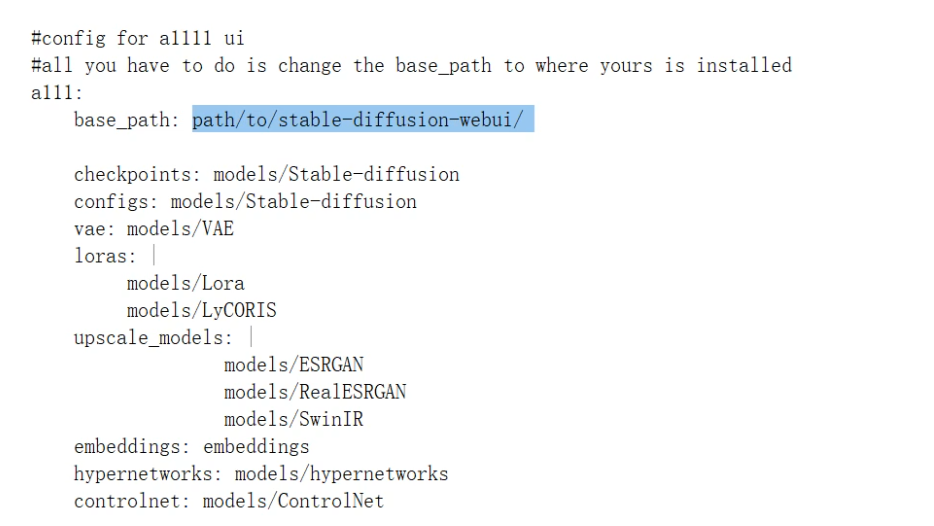 3.2.2、找到“base_path:path/to/stable-diffusion-webui/”后,删除“path/to/stable-diffusion-webui/”;