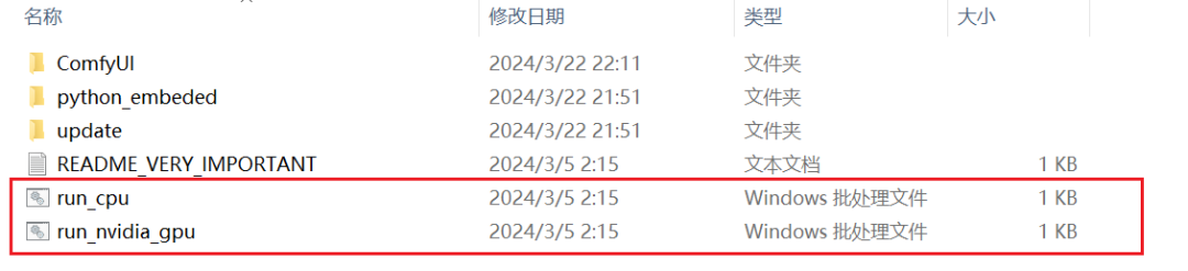 解压缩后会有以下6个文件:包括ComfyUI文件包、python文件包、更新文件包、安装说明文件、CPU启动文件以及GPU启动文件。