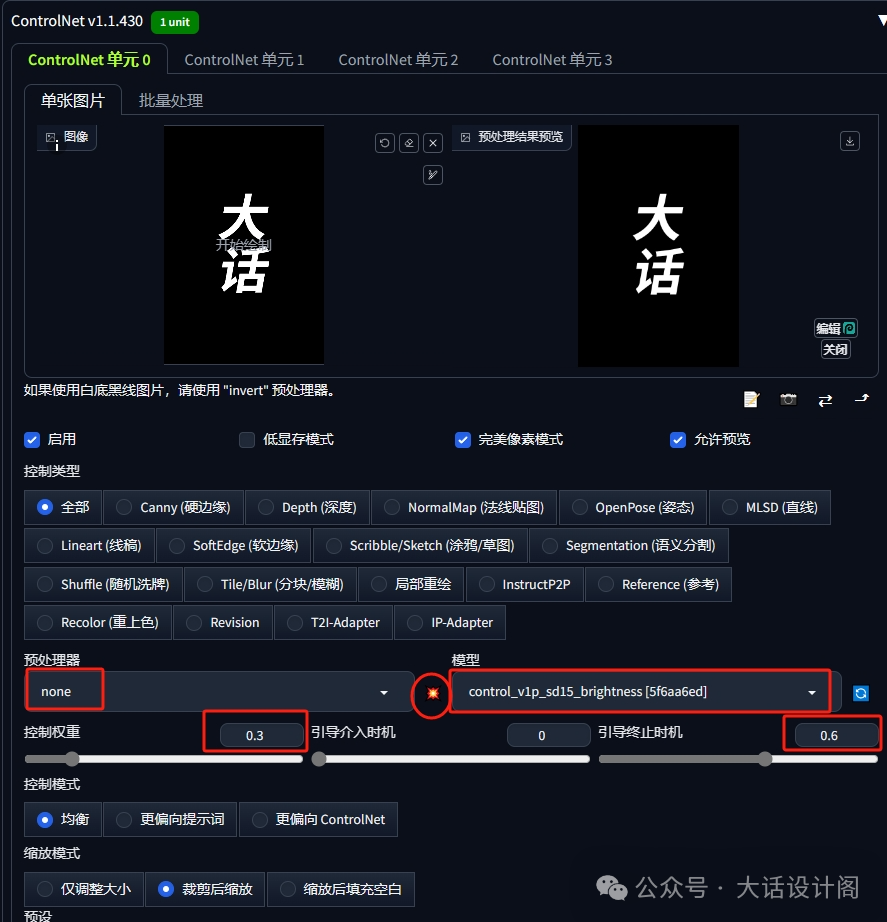 此处就用到模型:control_v1p_sd15_brightness,(记得中间的红点需要点一下)