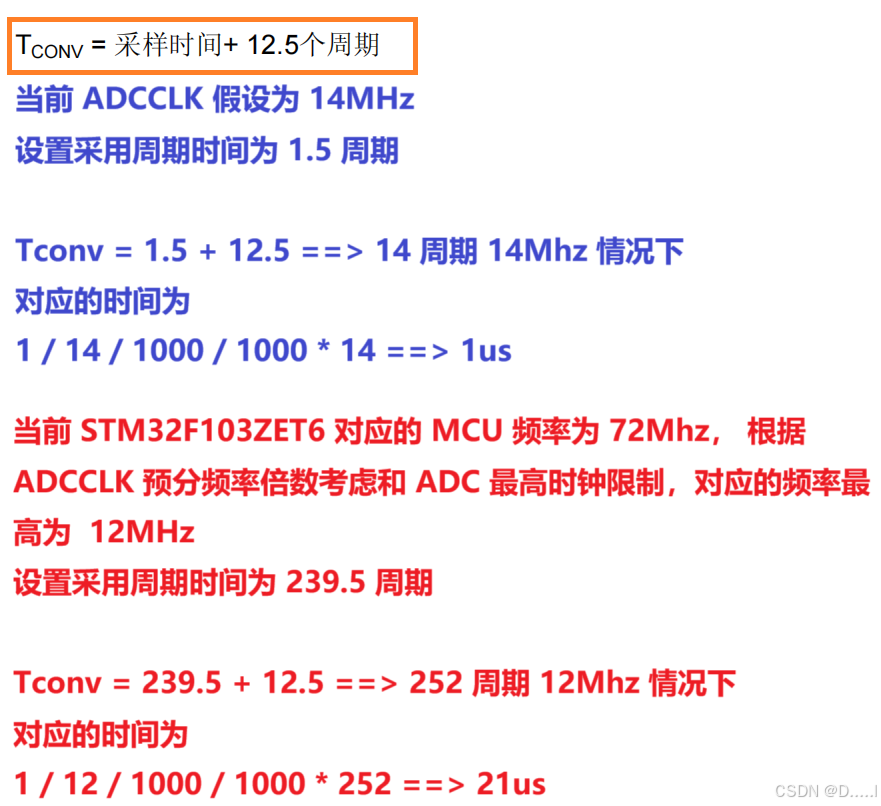- ADC 采样周期越长,对应的采样时间略高,同时 ADC 精度较高,适用于较大电阻电路。