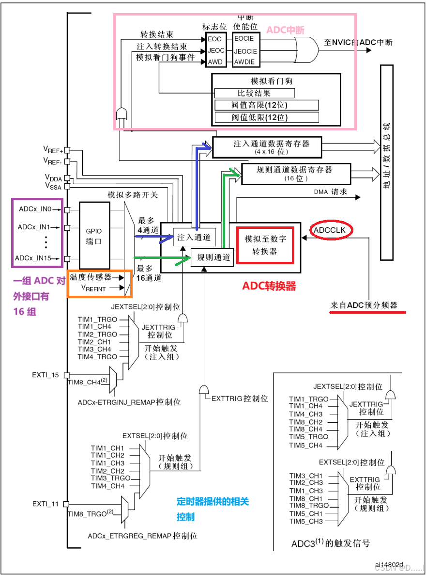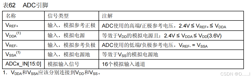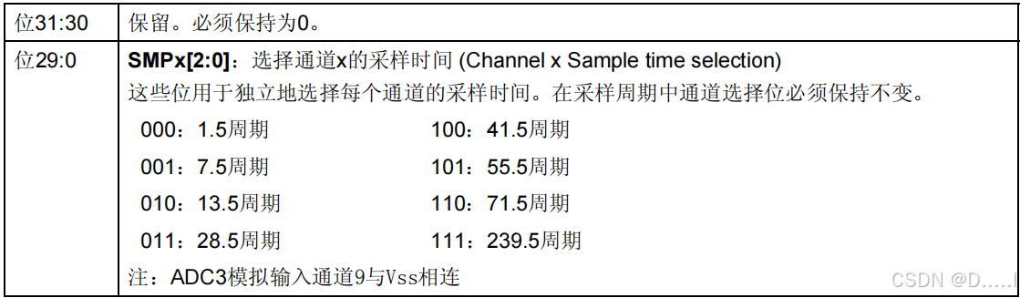 - ADC_SMPR1:SMP10 ~ SMP15 对应 ADC 对外通道, SMP16 对应 MCU 芯片内部温度 ADC ,SMP17 对应 MCU 工作电压 ADC