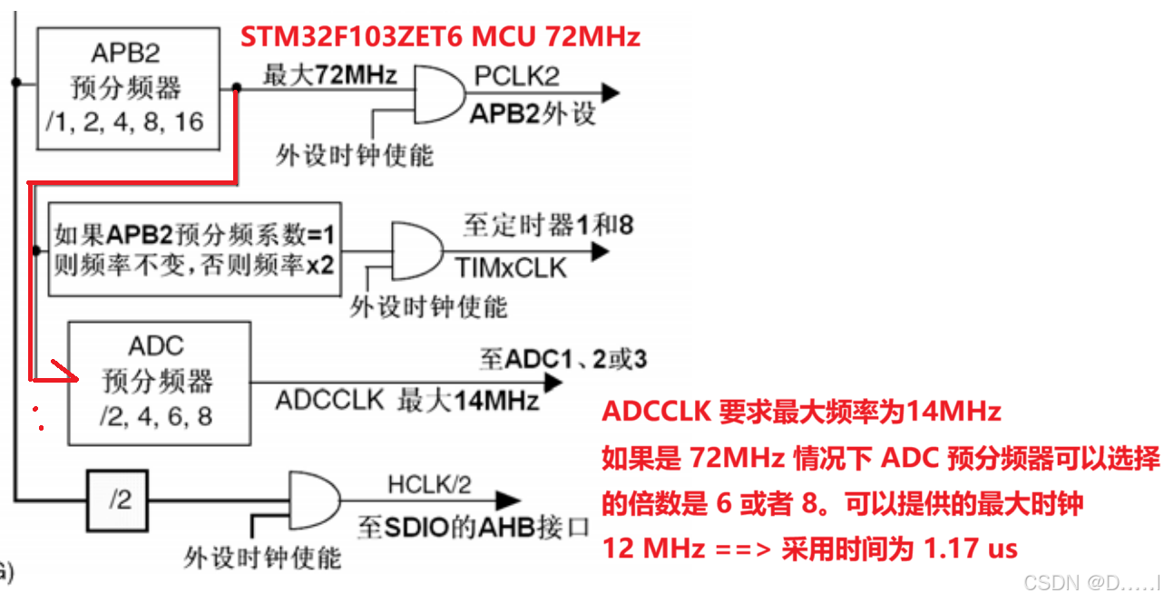 - 当前 STM32F103ZET6 对应 72 MHz ,ADCCLK 要求最大 14 MHz ,当前预分频器可选倍数 6 或则 8。