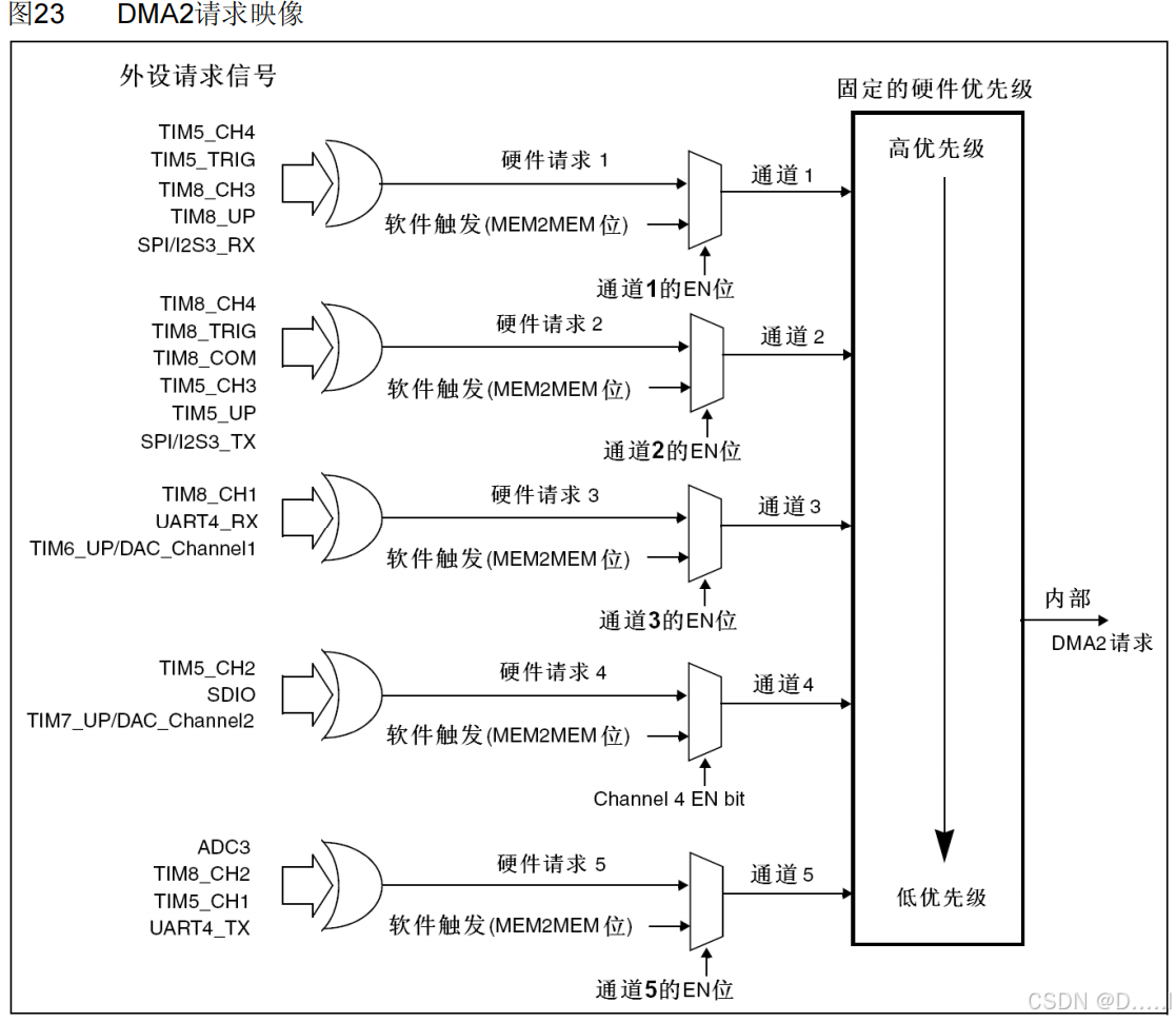 - 根据原理分析,和 DMA 映射关系分析,需要开启 DMA2 通道 5,根据当前数据情况完成开发