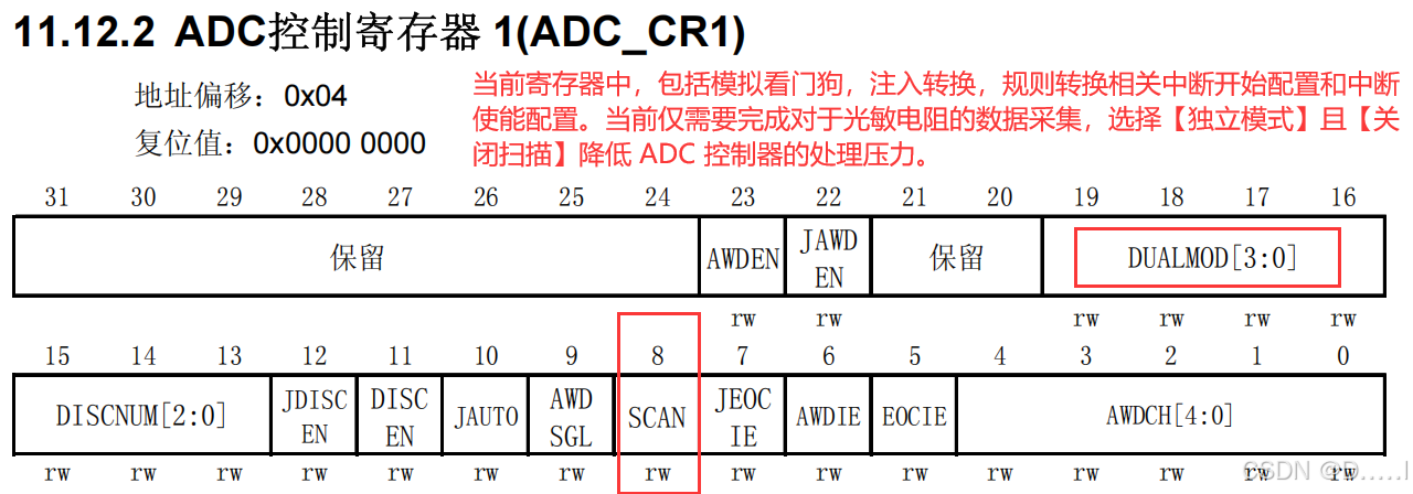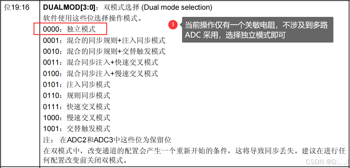 - DUALMOD位[19:16] : ADC 独立模式 ==> 0000