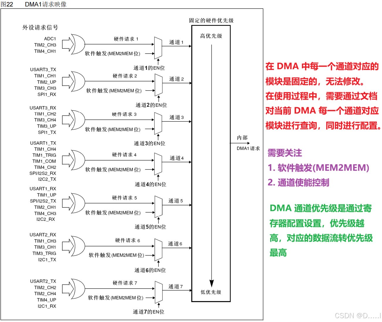 DMA 是一个通道!!!不占用内存空间,在 MCU 内部设计预留的数据管道。】