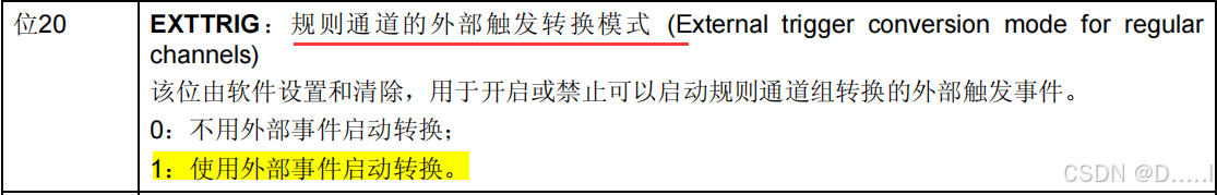 - EXTTRIG**[位20]**:规则通道的外部触发转换模式 ==> 1