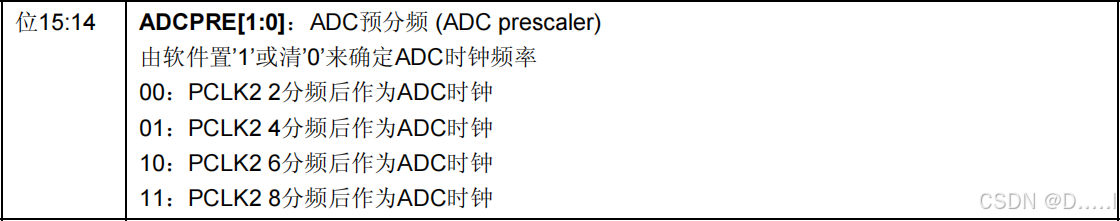 ADCCLK 不得大于 14 MHz,预分频倍数最小可以选择 6