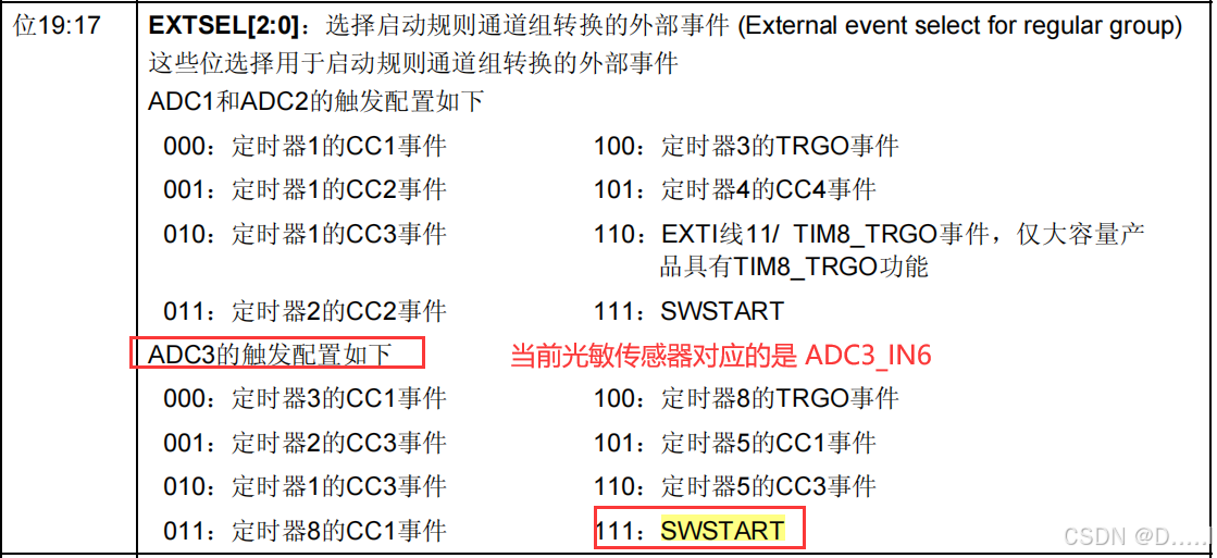 ADC3->CR2 |= (0x07 << 17); // EXTSEL [位19:17]: 选择启动规则通道组转换的外部事件 ==> 111