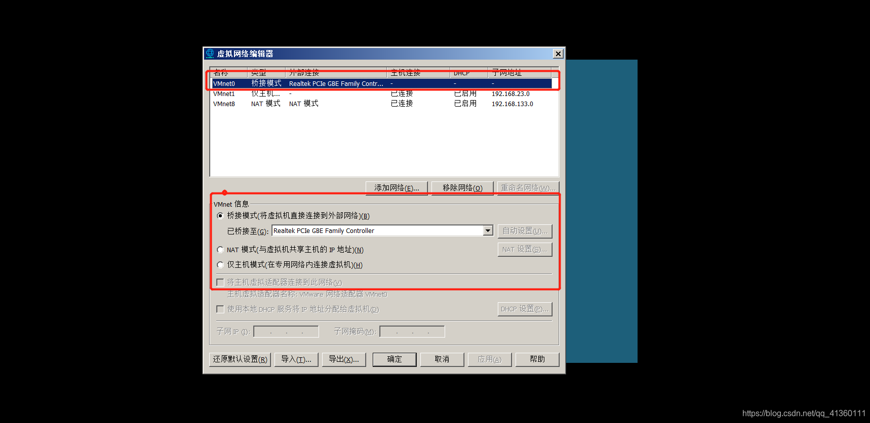 在“编辑”------“虚拟网络编辑器”里,有如下设置: