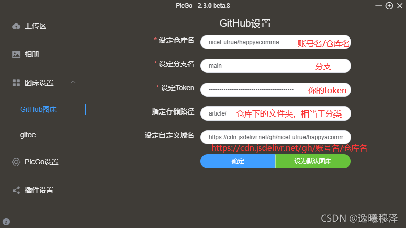 点击 PicGo配置 -> 选择GitHub图床 -> 图床设置 -> GitHub图床(GItHub设置)