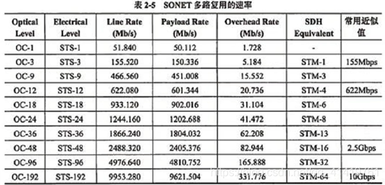 SONET OC-1 信道为50.112Mb/s (之后每个OC等级为上一等级3倍)