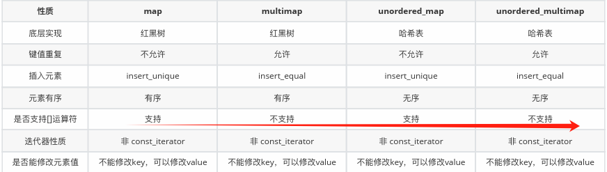 关联式容器从底层实现分为两类:①红黑树:set、map、multiset和multimap ②哈希:unordered_set、unordered_map、unordered_multiset和unordered_multimap。