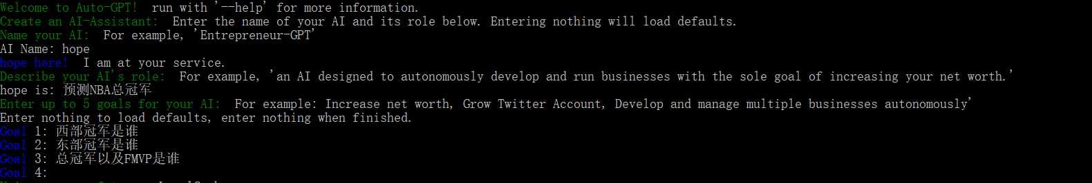 chatgpt是一问一答的形式,autogpt则是输入需要做的东西以及几个目标,例如: