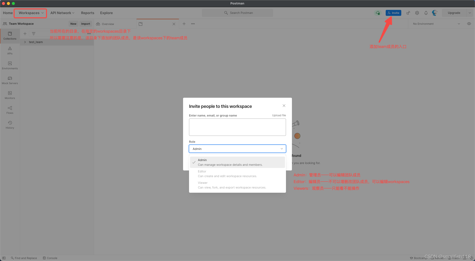Home目录下也可以添加team成员的,但无法编辑Role,所以建议从workspaces目录下添加。一般情况下,只有测试组长是Admin,其他团队成员都是Editor。
