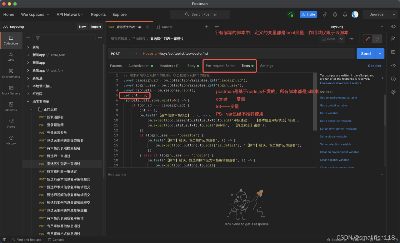 脚本中使用各变量就很简单了,get获取,set更新/新增,这里就不赘述了。需要注意的,postman是node.js开发的,编写的脚本也是js脚本,所以需要有一定js基础。例如:response中变量的获取(从json中获取指定key对应的value);类型转换;函数编写以及promise的作用等。
