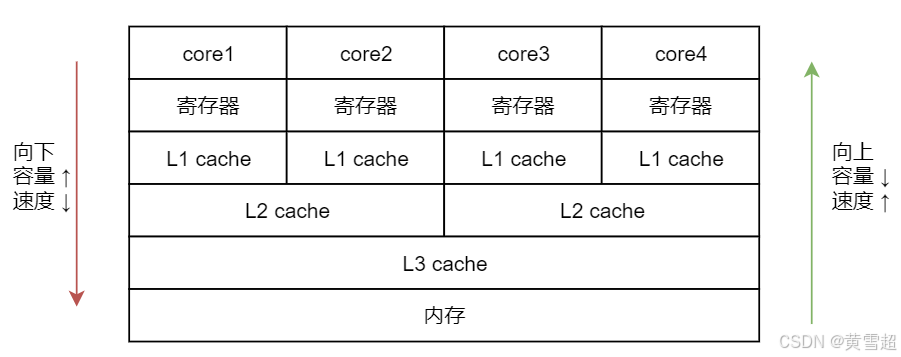 在图中,从下往上分别是内存,L3 缓存、L2 缓存、L1 缓存,寄存器,然后最上层是 CPU 的 4个核心。
