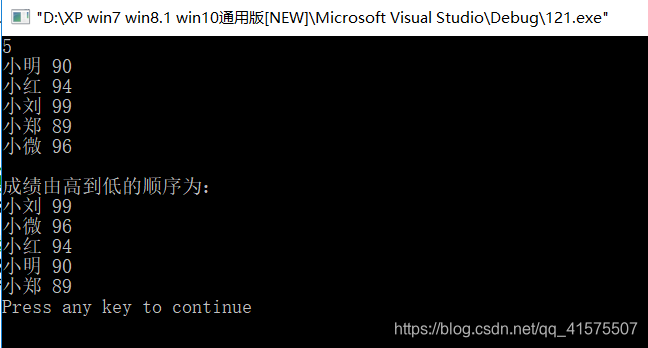 cout<<"成绩由高到低的顺序为:"<<endl;