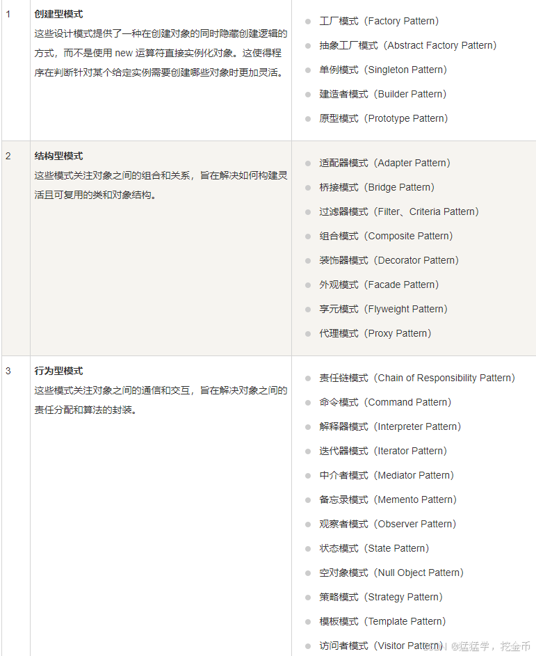 Java设计模式有很多种,通常被分为三大类:创建型模式、结构型模式、行为型模式。常见的设计模式有23种,它们是根据Gang of Four (GoF)(《设计模式:可复用面向对象软件的基础》)一书中的定义列举的。下面是这23种设计模式的分类和简介: