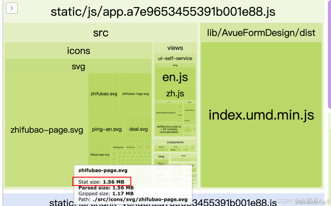在用webpack-bundle-analyzer查看包大小的时候,发现一个SVG竟然有1.5M!你敢信?而且SVG不会经过打包有大小变化,就是即使经过Webpack打包,Gzip压缩,他也会占用1.5M的的大小,优化前也才5.9M,所以1.5M占比很大需要优化。