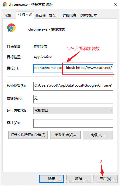 设置参数,--kiosk https://www.csdn.net/ 的含义是开启浏览器时,以全屏的方式访问CSDN