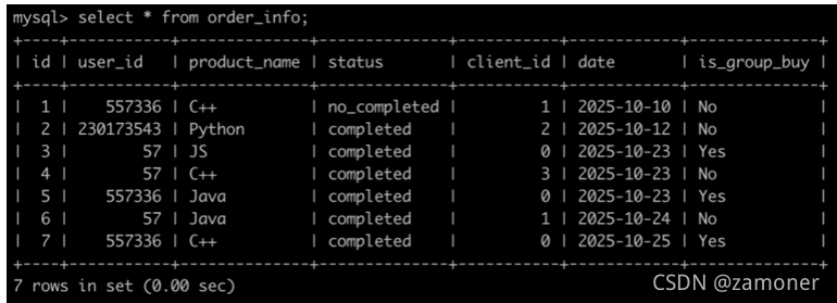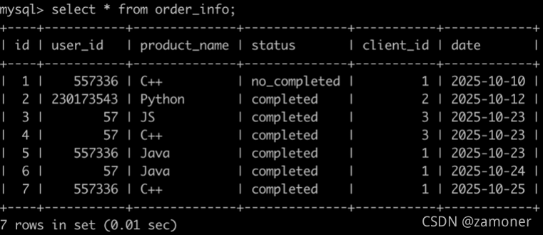 4.请你写出一个sql语句查询在2025-10-15以后,同一个用户下单2个以及2个以上状态为购买成功的C++课程或Java课程或Python课程的订单id,是否拼团以及客户端名字信息,最后一列如果是非拼团订单,则显示对应客户端名字,如果是拼团订单,则显示NULL,并且按照order_info的id升序排序。
