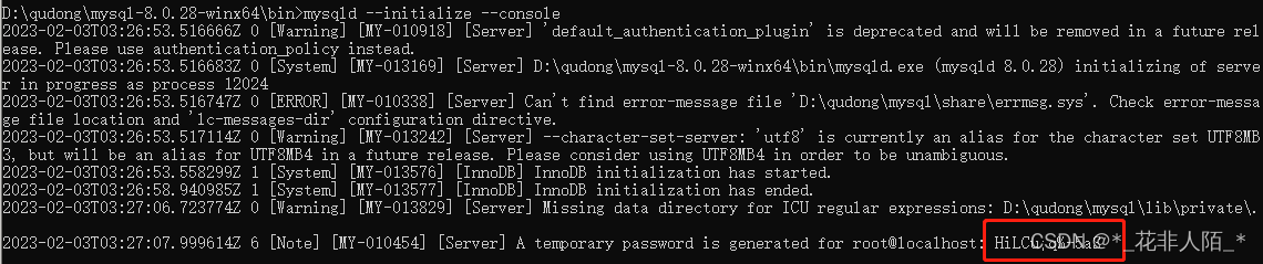 mysqld --initialize --console #安装完成后Mysql会生成一个随机密码,记得保存好