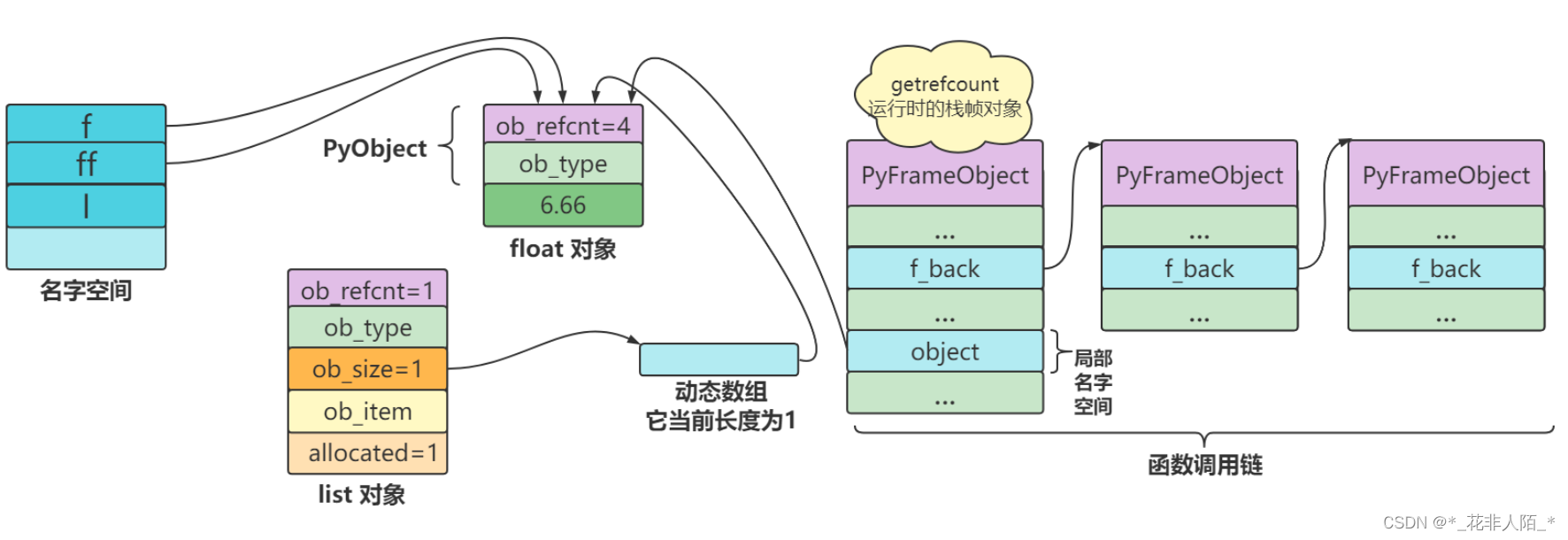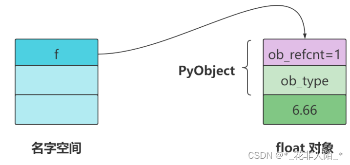 >>> import sys >>> f = 6.66 >>> sys.getrefcount(f) 2 ''' 引用计数器赋值是1,结果输出的是2 原因:初始化引用计数器赋值是1,当把对象作为函数参数传递给sys模块时, 会产生一个临时的引用,当输出这个值的时候永远要比实际+1,但实际他还是1 sys.getrefcount()函数返回指定对象的引用计数。 引用计数是一种追踪Python对象生命周期的技术,它表示指向该对象的引用数量。 '''当把 f 赋值给 ff 后,float对象的引用计数就变成了2,因为现在有两个变量在引用它