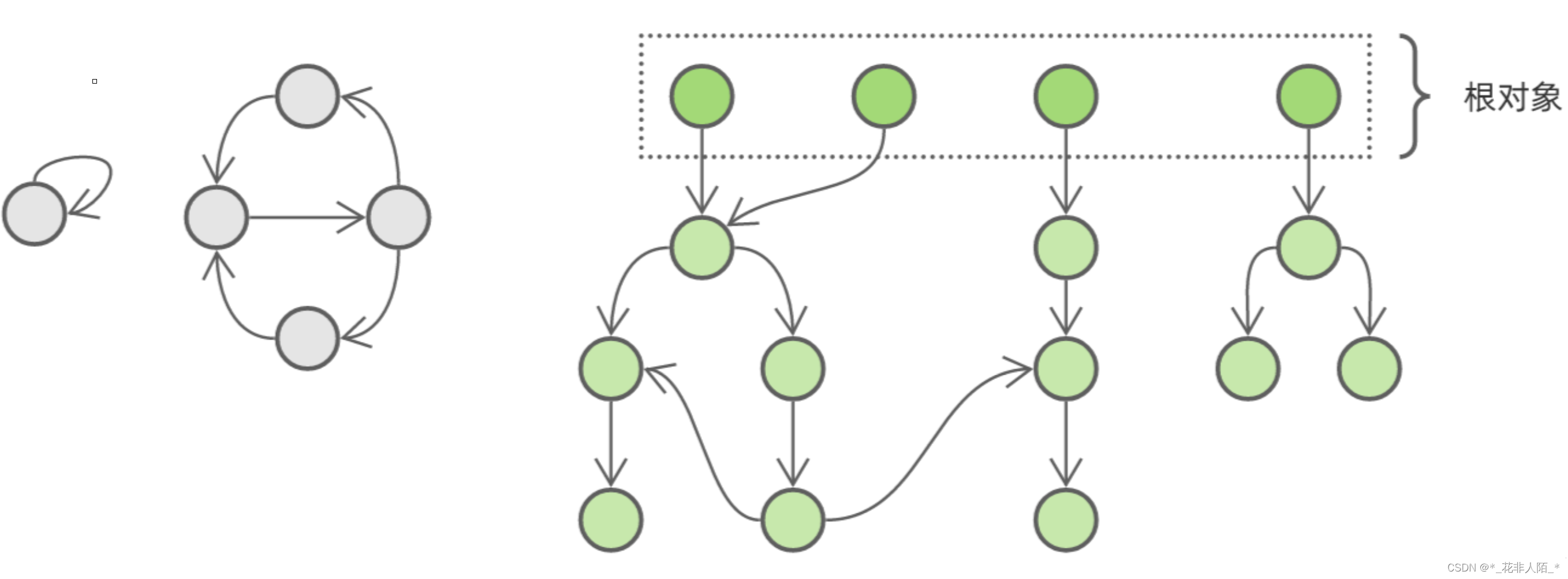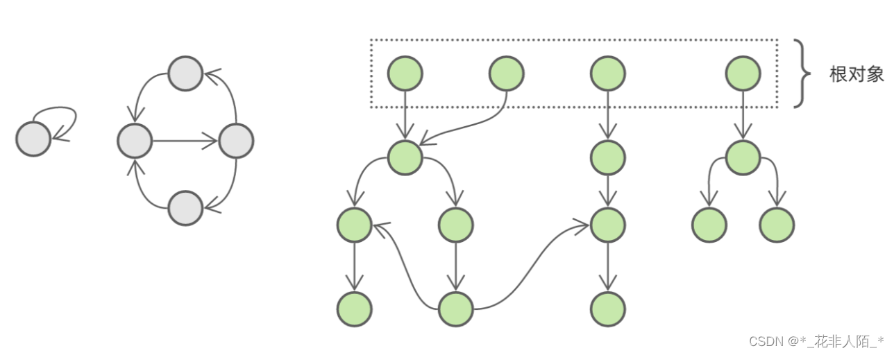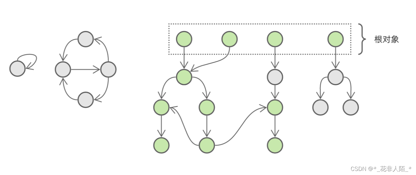 这是一个对象引用关系图,其中灰色部分是需要回收但由于循环引用而无法回收的垃圾对象,绿色部分是被程序引用而不能回收的活跃对象。如果我们能够将活跃对象逐个遍历并标记,那么最后没有被标记的对象就是垃圾对象。