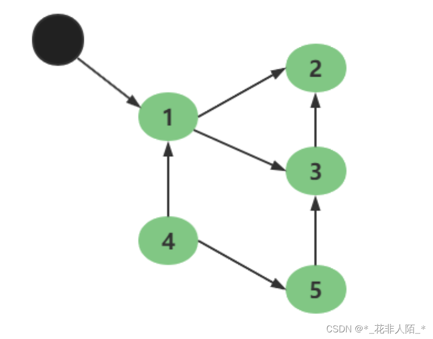 下图中小黑点(变量)表示根节点,从根节点出发,每个对象都有引用和被引用的情况,如果该对象找不到根节点,那么就会被清除,如图1,2,3都有被小黑点(变量)引用,4,5没有变量引用,所以4,5就会被清除。