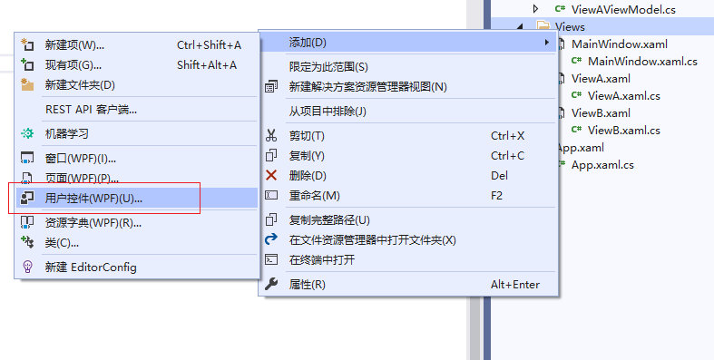 在MainWindowViewModel中实现对区域内容的设置。以打开A为例,创建按钮,然后实现打开A的函数功能。