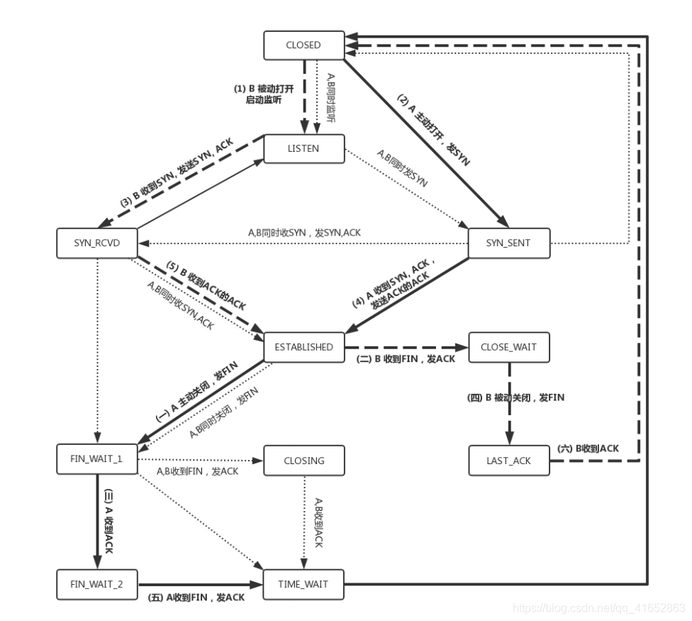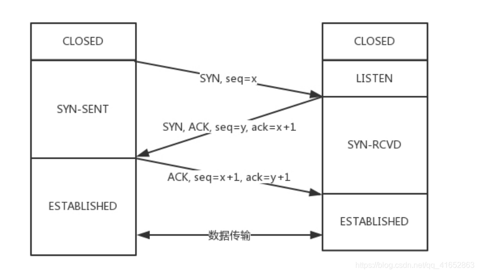 一开始,客户端和服务端都处于 CLOSED 状态。先是服务端主动监听某个端口,处于 LISTEN 状态。然后客户端主动发起连接 SYN,之后处于 SYN-SENT 状态。服务端收到发起的连接,返回 SYN,并且ACK 客户端的 SYN,之后处于 SYN-RCVD 状态。客户端收到服务端发送的 SYN 和 ACK 之后,发送ACK 的 ACK,之后处于 ESTABLISHED 状态,因为它一发一收成功了。服务端收到 ACK 的 ACK 之后,处于 ESTABLISHED 状态,因为它也一发一收了。