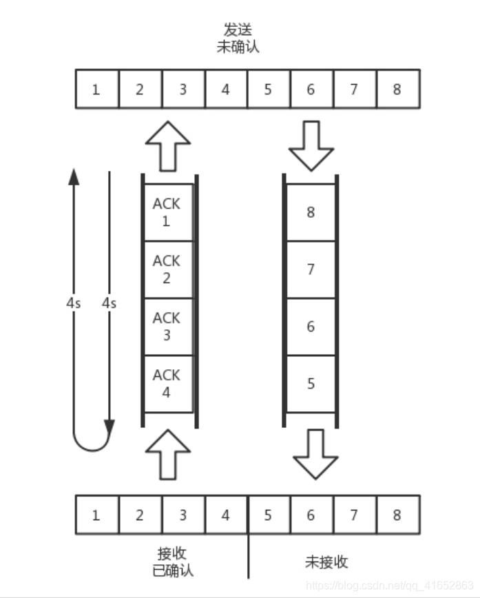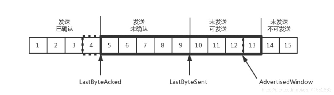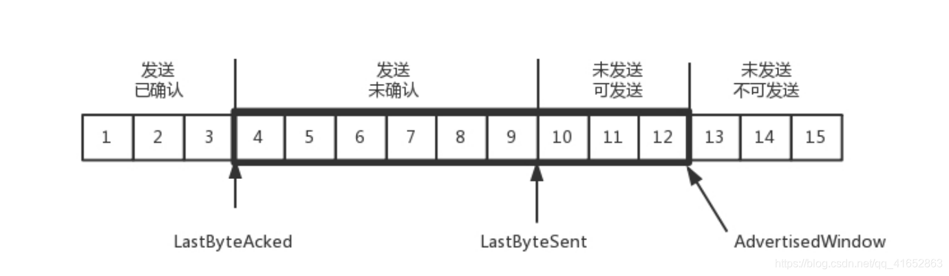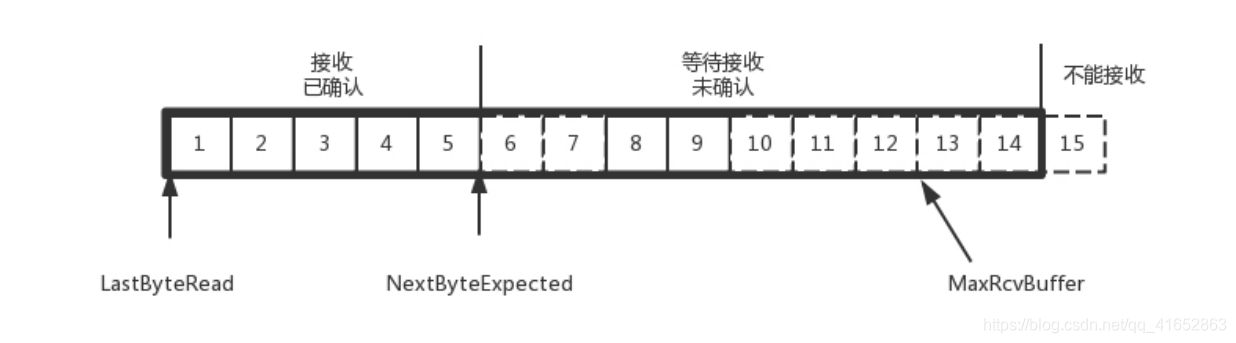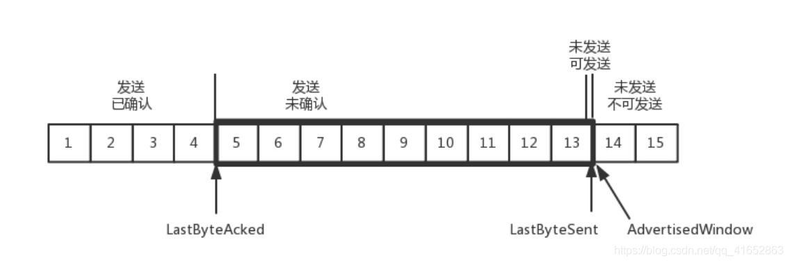 还是刚才的图,在发送端来看,1、2、3 已经发送并确认;4、5、6、7、8、9 都是发送了还没确认;10、11、12 是还没发出的;13、14、15 是接收方没有空间,不准备发的。在接收端来看,1、2、3、4、5 是已经完成 ACK,但是没读取的;6、7 是等待接收的;8、9 是已经接收,但是没有 ACK 的。