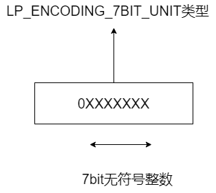 此时,编码类型和元素实际数据共用 1 个字节,这个字节的最高位为 0,表示编码类型,后续的 7 位用来存储 7 bit 的无符号整数,如下图所示: