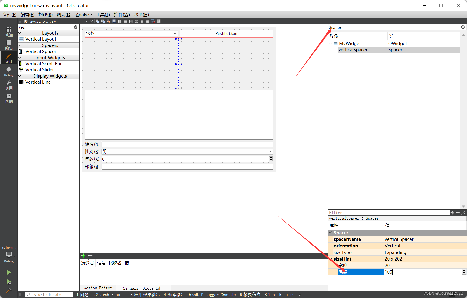 这时可以在右上角的对象列表中选择分隔符Spacer,然后在属性栏中设置它的高度为100,如下图所示。这时运行程序可以看到,分隔符是不显示的。