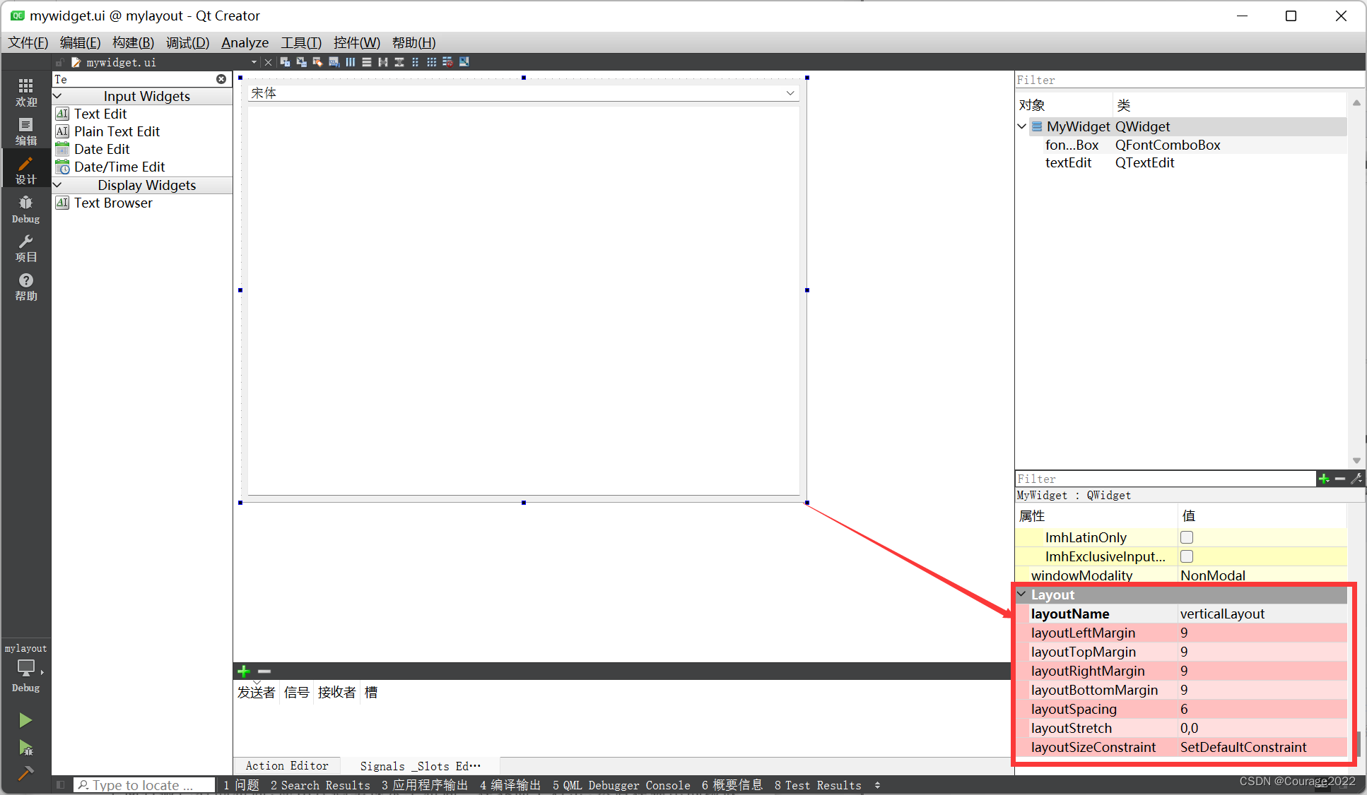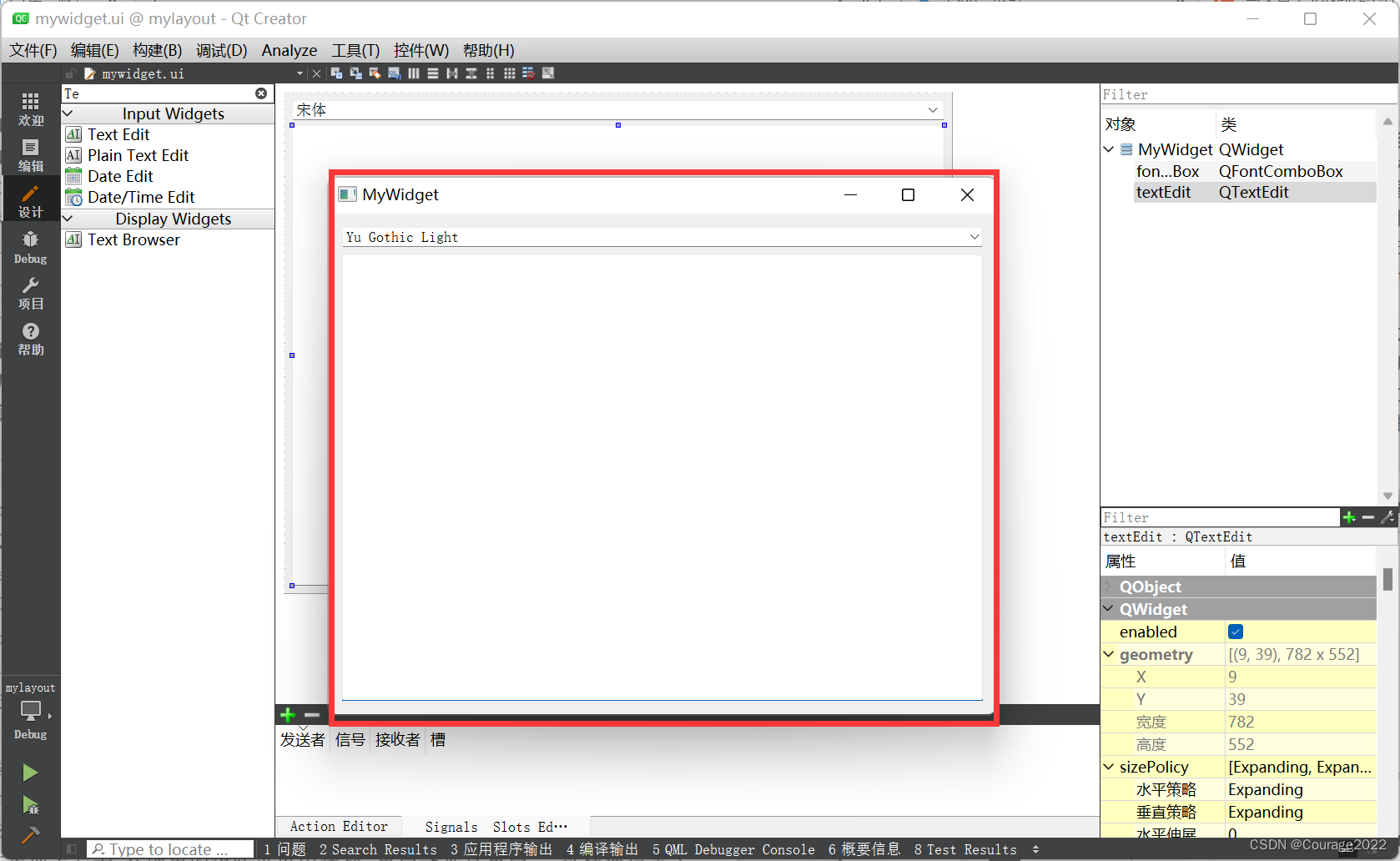 下面先来看一个例子。打开Qt Creator,新建Qt Widgets应用,项目名称为mylayout,基类选择QWidget,类名设为MyWidget。完成后打开 mywidget. ui文件,在设计模式中向界面上拖入一个字体选择框Font Combo Box和一个文本编辑器Text Edit部件。