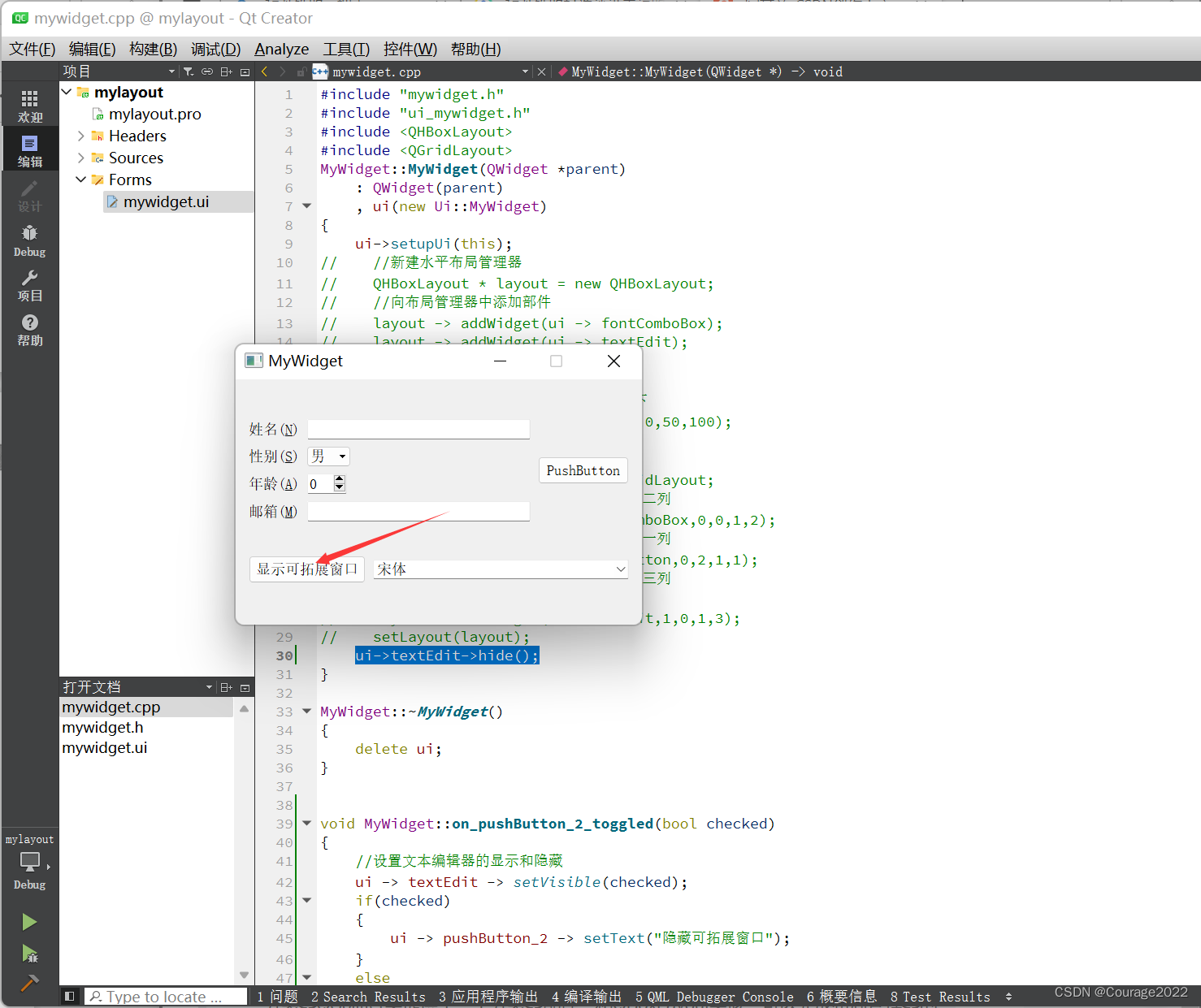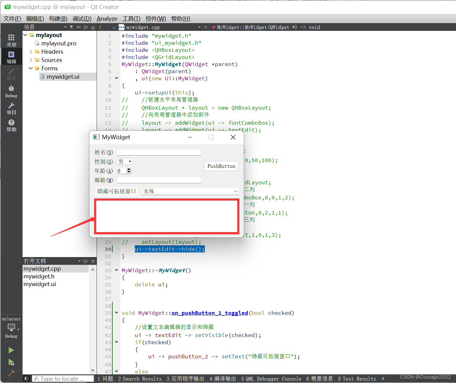 void MyWidget::on_pushButton_2_toggled(bool checked) { //设置文本编辑器的显示和隐藏 ui -> textEdit -> setVisible(checked); if(checked) { ui -> pushButton_2 -> setText("隐藏可拓展窗口"); } else { ui -> pushButton_2 -> setText("显示可拓展窗口"); } }这里使用按钮的按下与否两种状态来设置文本编辑器是否显示,并且相应地更改按钮的文本。为了让文本编辑器在一开始是隐藏的,还要在 MyWidget类的构造函数中添加一行代码: