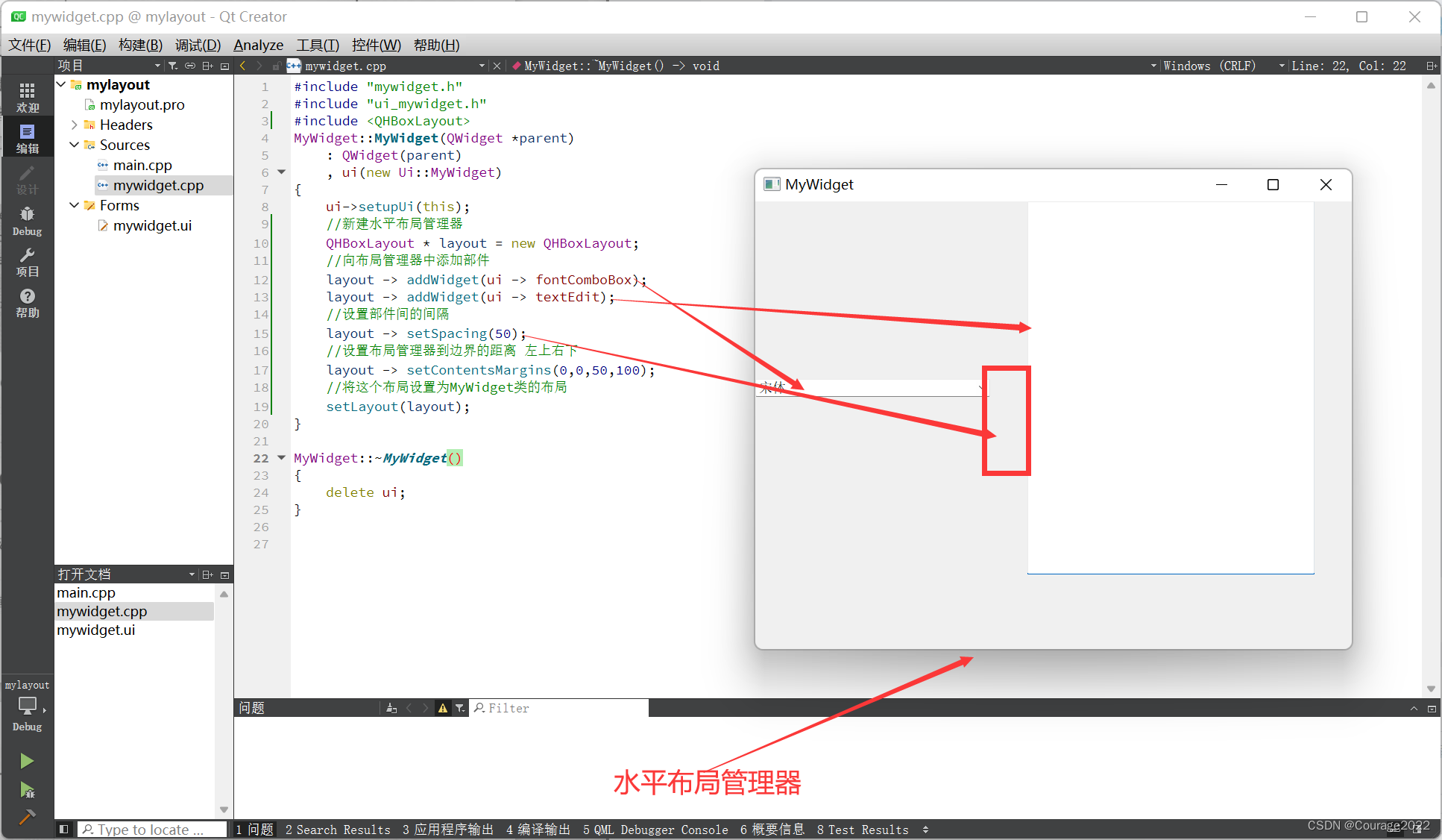 MyWidget::MyWidget(QWidget *parent) : QWidget(parent) , ui(new Ui::MyWidget) { ui->setupUi(this); //新建水平布局管理器 QHBoxLayout * layout = new QHBoxLayout; //向布局管理器中添加部件 layout -> addWidget(ui -> fontComboBox); layout -> addWidget(ui -> textEdit); //设置部件间的间隔 layout -> setSpacing(50); //设置布局管理器到边界的距离 左上右下 layout -> setContentsMargins(0,0,50,100); //将这个布局设置为MyWidget类的布局 setLayout(layout); }