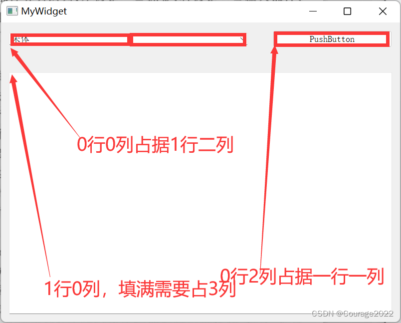 MyWidget::MyWidget(QWidget *parent) : QWidget(parent) , ui(new Ui::MyWidget) { ui->setupUi(this); // //新建水平布局管理器 // QHBoxLayout * layout = new QHBoxLayout; // //向布局管理器中添加部件 // layout -> addWidget(ui -> fontComboBox); // layout -> addWidget(ui -> textEdit); // //设置部件间的间隔 // layout -> setSpacing(50); // //设置布局管理器到边界的距离 左上右下 // layout -> setContentsMargins(0,0,50,100); // //将这个布局设置为MyWidget类的布局 // setLayout(layout); QGridLayout * layout = new QGridLayout; //添加部件,从第0行0列开始,占据一行二列 layout -> addWidget(ui->fontComboBox,0,0,1,2); //添加部件,从第0行2列开始,占据一行一列 layout -> addWidget(ui->pushButton,0,2,1,1); //添加部件,从第1行0列开始,占据一行三列 layout -> setSpacing(50); layout -> addWidget(ui->textEdit,1,0,1,3); setLayout(layout); }这里主要是设置部件在栅格布局管理器中的位置,将fontComboBox部件设置为占据1行2列,而pushButton部件占据1行1列,这主要是为了将fontComboBox部件和 pushButton部件的长度设置为2:1。这样一来, textEdit部件要想占满剩下的空间,就要使它的跨度为3列。