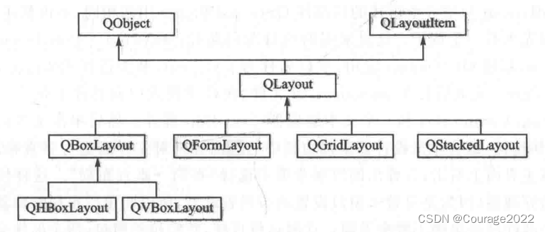 Qt主要提供了QLayout类及其子类来作为布局管理器,它们可以实现常用的布局管理功能,QLayout及其子类的关系如下图所示。本章还会涉及Buddy 、Tab键顺序设置等内容。