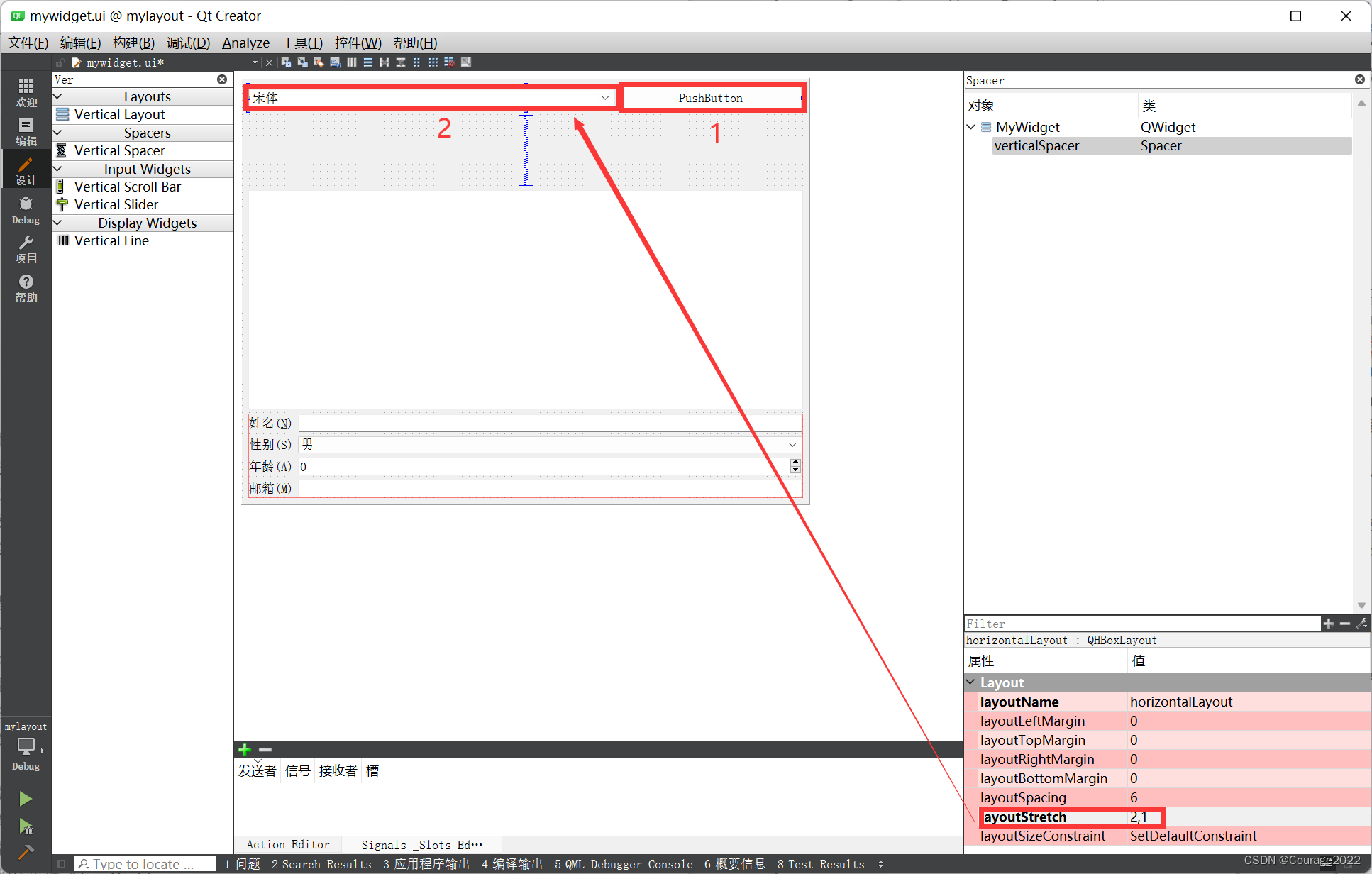 界面上的字体选择框和一个按钮处于一个水平布局管理器中,现在想让它们的宽度比例为2:1 ,那么就可以单击对象栏中的horizontalLayout水平布局管理器对象,然后在它的属性栏中将layoutStretch属性设置为“2,1”,这样这个水平布局管理器中的两个部件的宽度就是2:1的比例了。如果要在代码中进行设置,则可以在使用布局管理器的addWidget()函数添加部件的同时,在第二个参数中指定伸缩因子。