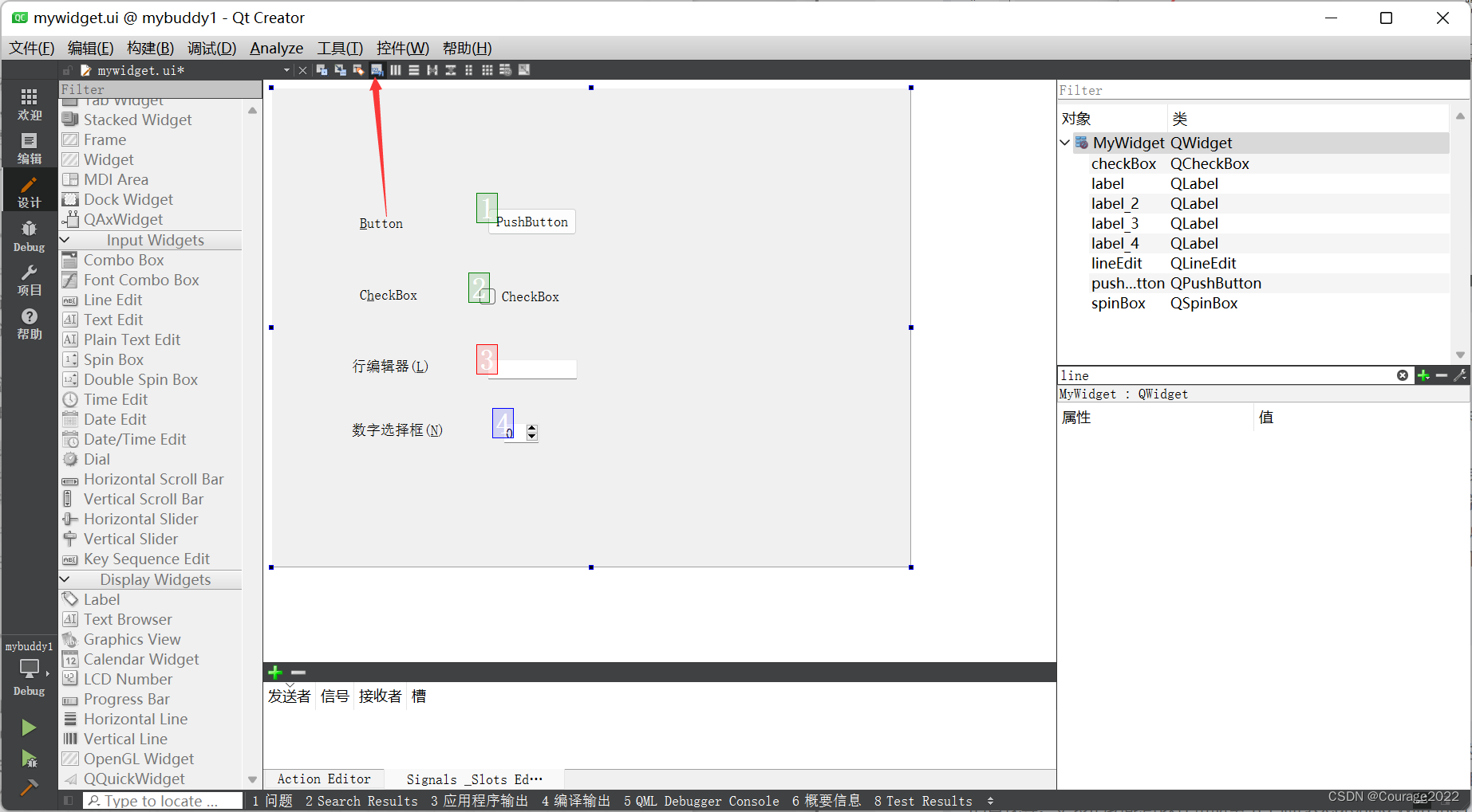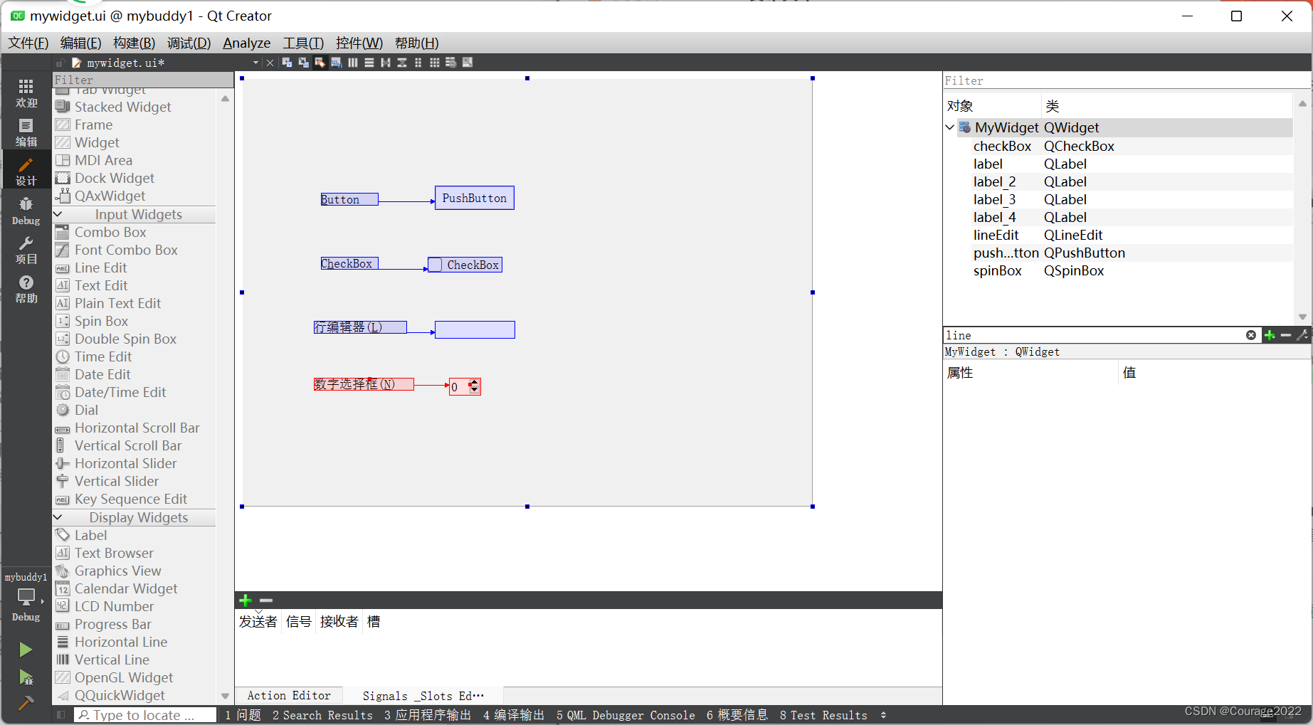完成后打开mywidget.ui 文件,往界面上拖放4个标签Label,再在标签后面依次放上PushButton、 CheckBox、LineEdit和SpinBox。然后将PushButton前面的标签文本改为“&Button:”,CheckBox前面的标签文本改为“C&heckBox:”,LineEdit前面的标签文本改为“行编辑器(&L):”,SpinBox前面的标签文本改为“数字选择框(&N):”。