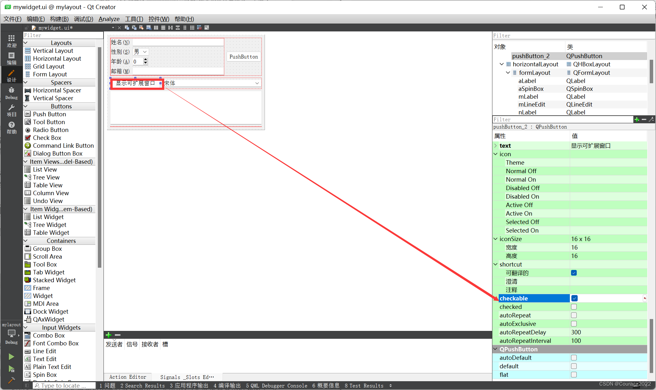依然在前面的程序中进行更改。首先将界面上的 pushButton显示文本更改为“显示可扩展窗口”,并在其属性栏选中 checkable选项。