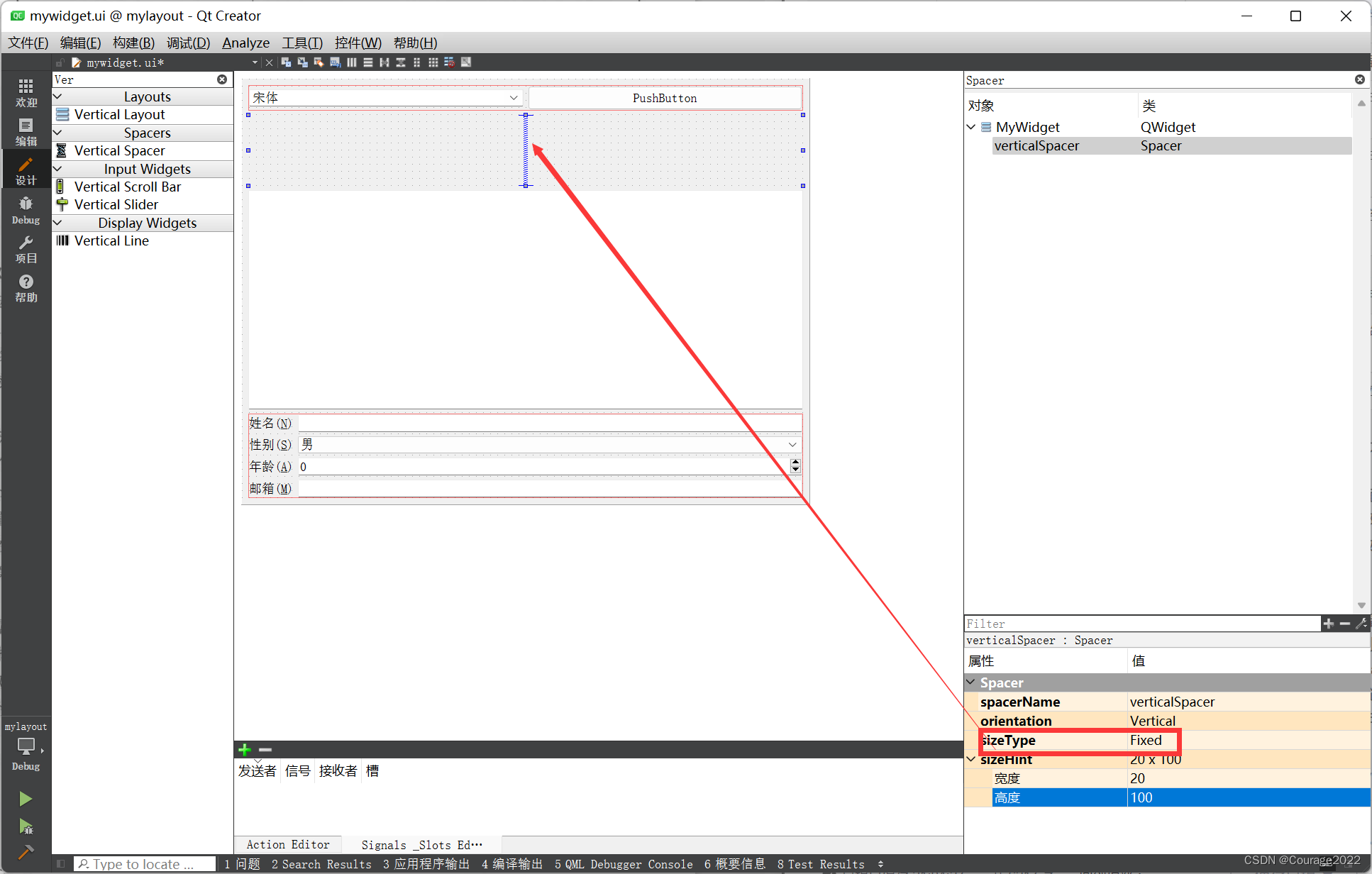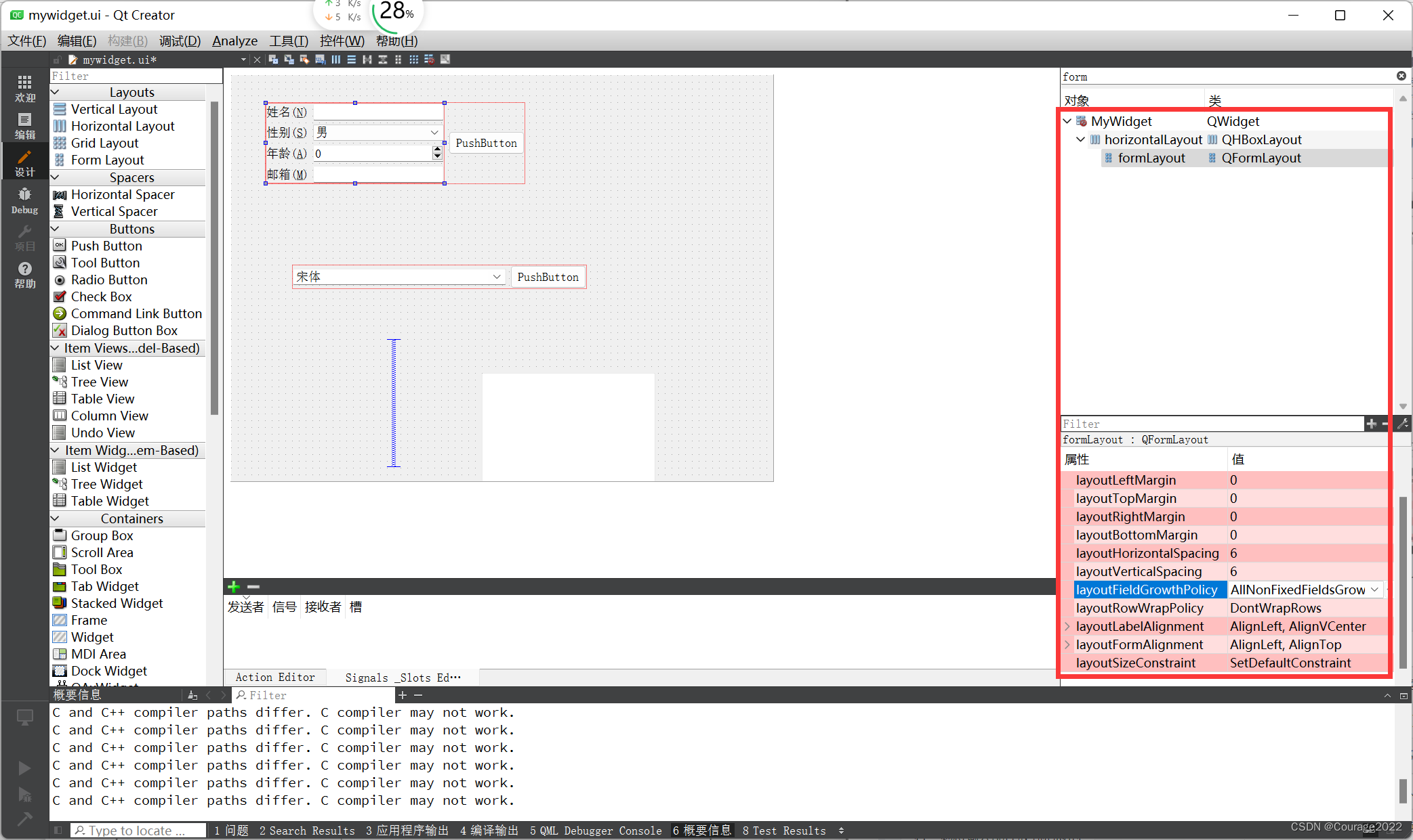 说明 值 说明 指定部件的大小变化方式 AlINonFixedFieldsGrow 所有的部件都被拉伸,这是默认值 FieldsStayAtSizeHint 所有的部件都使用sizeHint()提供的大小 ExpandingFieldsGrow 大小策略为Expanding的部件会被拉伸 设置是否换行:如果需要换行,则将输入部件放到相应的标签下面 DontWrapRows 不换行,这是默认值 WrapLongRows 将较长的行进行换行 WrapAllRows 将所有行都换行,这样所有的输入部件都会放置在相应的标签下面 设置标签的对其方式,分为水平方向和垂直方向 水平方向 AlignLeft 左对齐 AlignRight 右对齐 AlignHCenter 水平居中对齐 AlignJustify 两端对齐 垂直方向 AlignTop 向上对齐 AlignBottom 向下对齐 AlignVCenter 垂直居中对齐 设置部件在表单中的对齐方式 同layoutLabelAlignment属性 同layoutLabelAlignment属性 对于layoutFieldGrowthPolicy属性,这里选择ExpandingFieldsGrow选项,这样性别和年龄两个输入框就没有那么宽了,更符合美观要求。然后将界面中的“邮箱”标签更改为“邮箱地址”,在 layoutLabelAlignment属性中选择AlignRight。