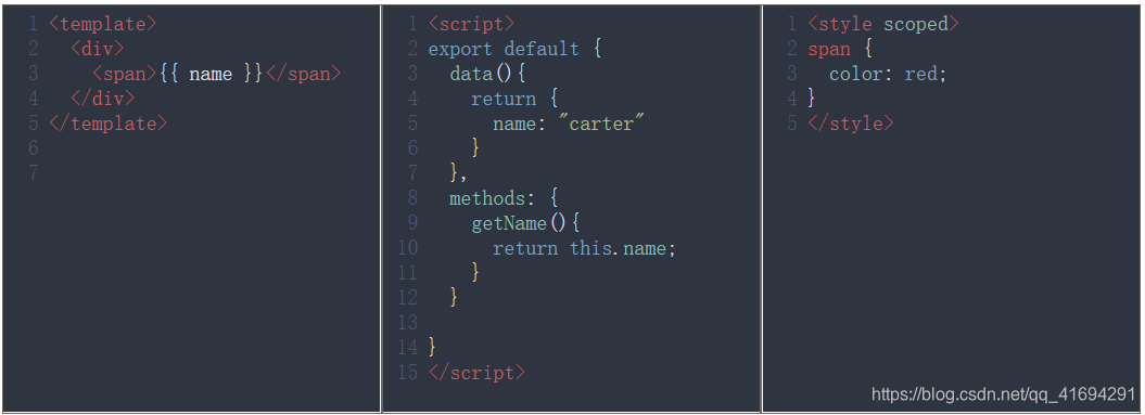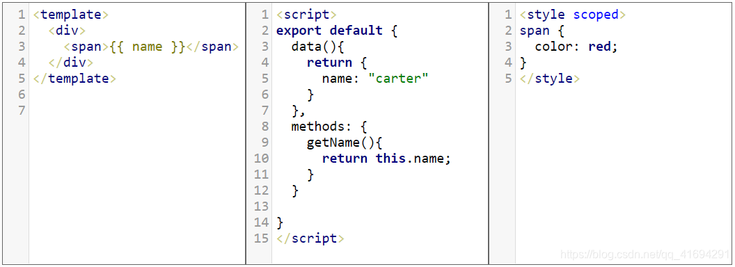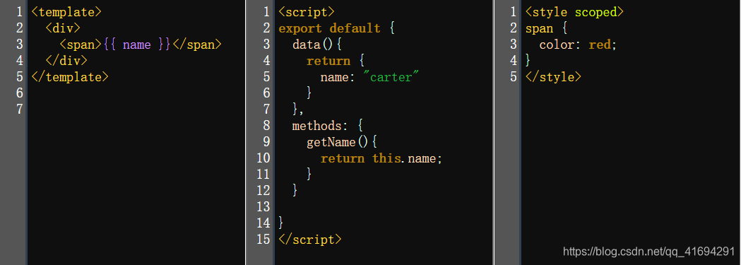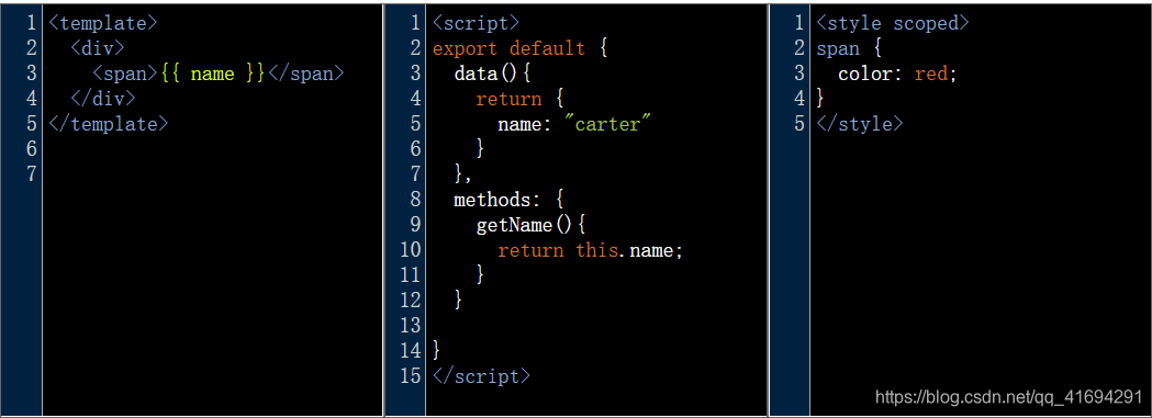 本文使用的目标对象是vue,其他语言或框架也是类似的。为了减小纵向篇幅,这里使用了三个codemirror,分别展示template、script和style的效果。