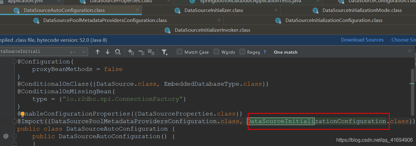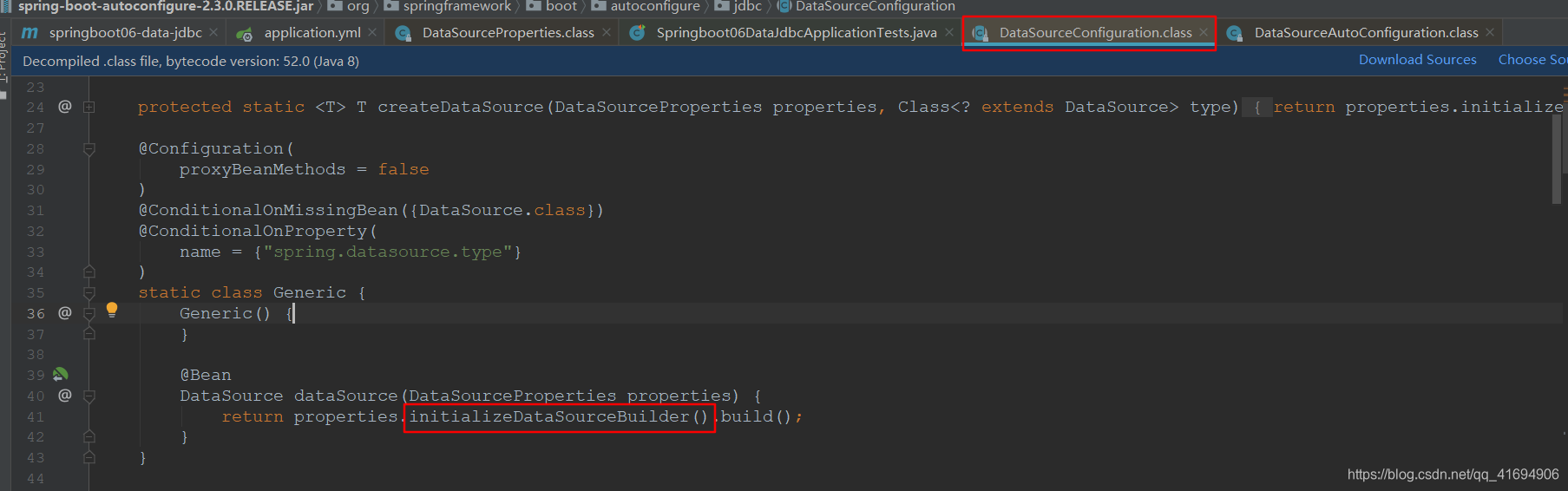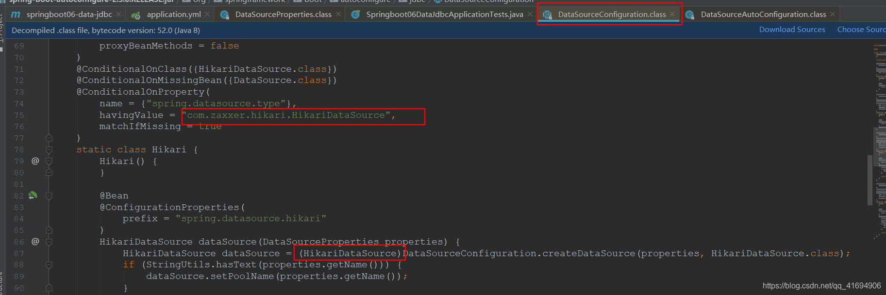 数据源的相关配置都在DataSourceProperties里面;ctrl+点击配置文件中刚才配置的属性就可以进入;