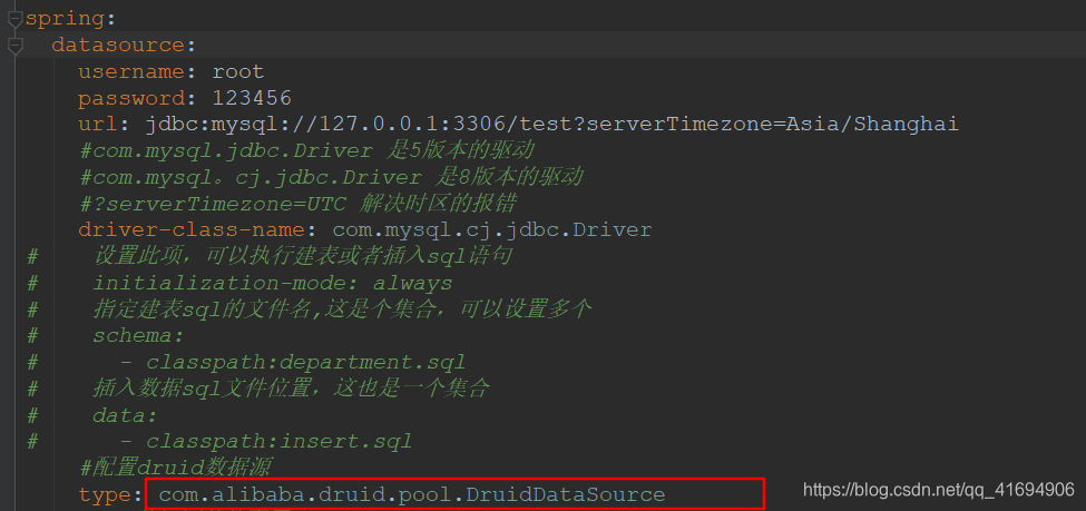由于springboot默认不支持druid数据源,需要配置type